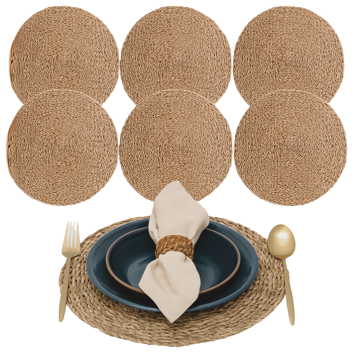 Elegância Natural: O trançado artesanal em fibras naturais cria uma textura única, que transmite aconchego e dá destaque especial às refeições. Um detalhe que combina com estilos do clássico ao contemporâneo.